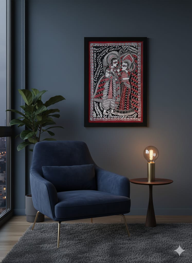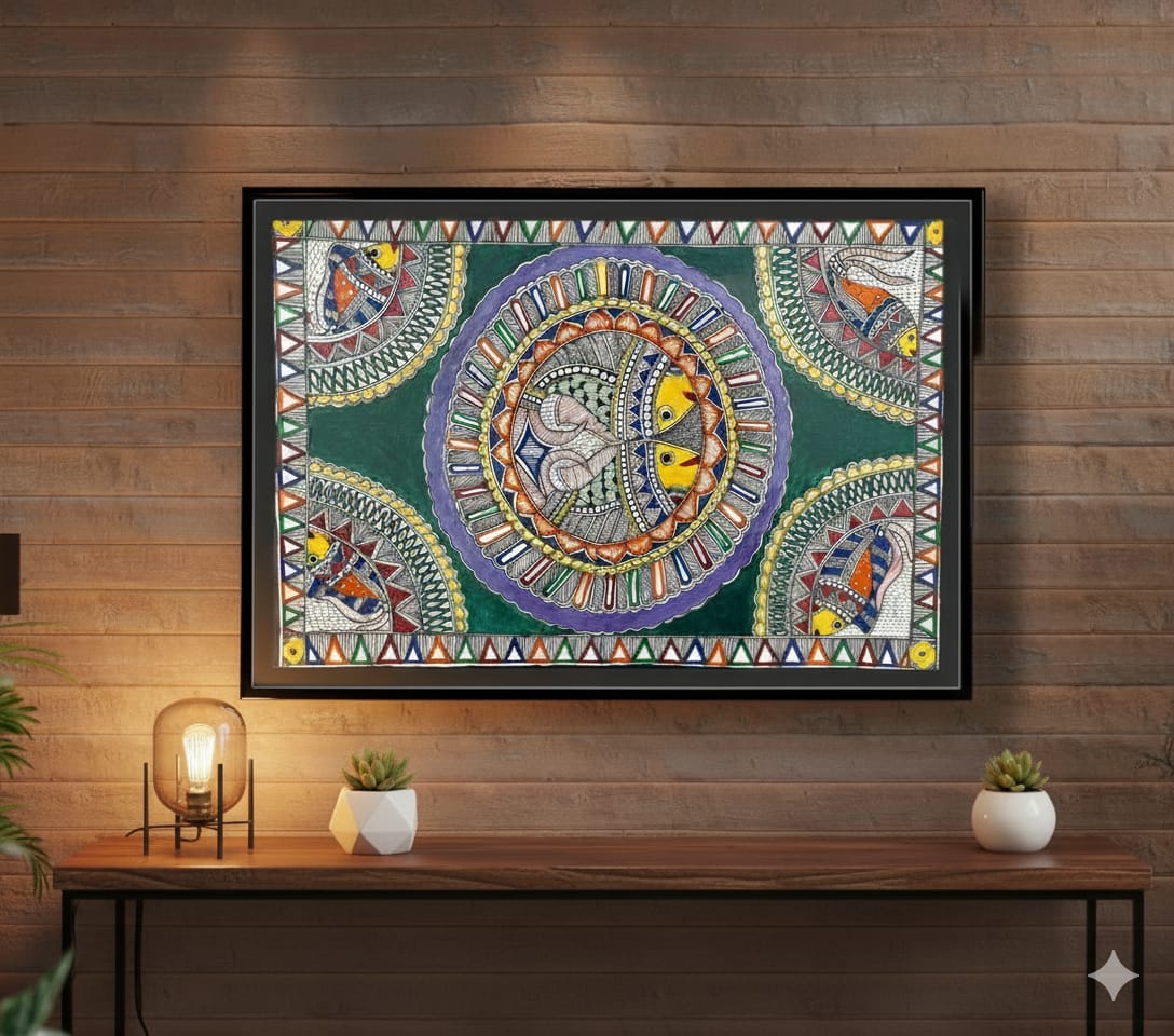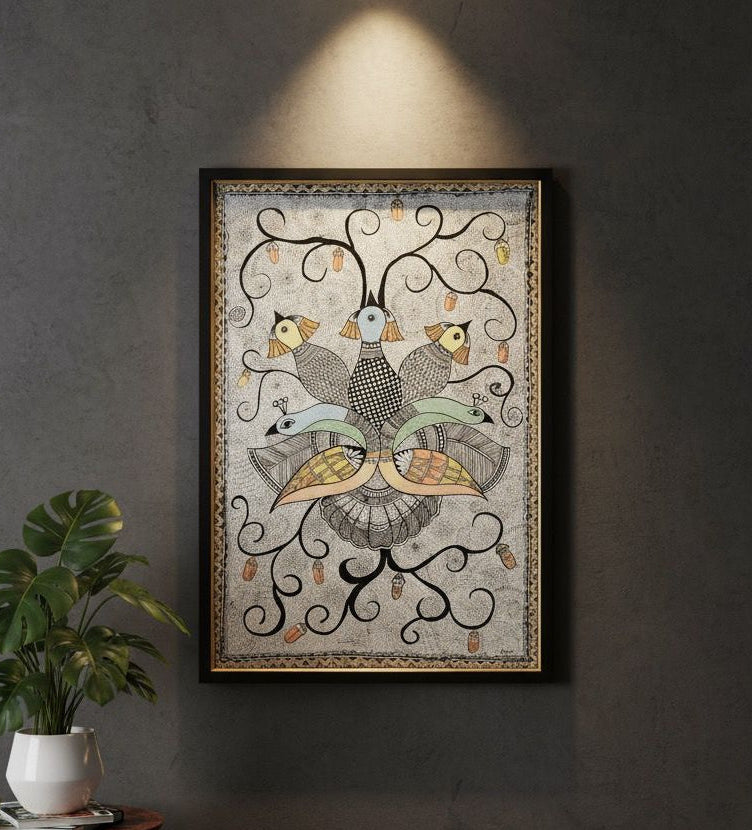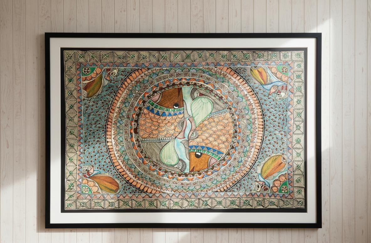 Our Madhubani paintings feature distinctive elements including intricate line work, bold colors, and symbolic imagery created using natural materials.