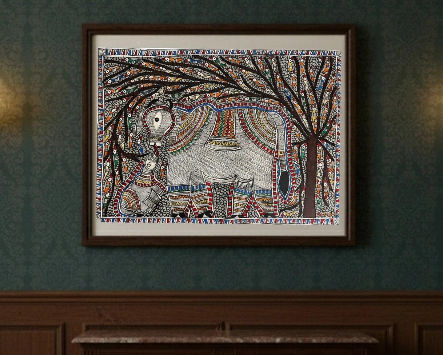 Kamdhenu, the celestial cow of Hindu mythology, comes to life through this exquisite Madhubani painting. This traditional art form, originating from Bihar's Mithila region, showcases intricate geometric patterns and vibrant natural pigments that have been used for generations. The artist captures the divine essence of Kamdhenu with meticulous detail, featuring ornamental motifs and symbolic elements characteristic of this ancient craft. Each brushstroke reflects centuries of artistic heritage, making this piece both a spiritual symbol and a masterwork of folk artistry. Perfect for collectors and enthusiasts of Indian classical art, this painting brings cultural authenticity and timeless beauty to any space.