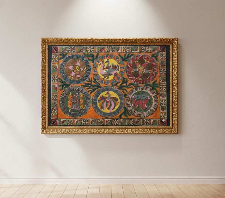 Shad Chakra represents a masterwork of traditional Madhubani artistry, showcasing the intricate geometric and spiritual symbolism characteristic of this ancient Bihar art form. Each element is meticulously hand-painted with natural pigments, featuring the distinctive bold lines and vibrant color palette that define authentic Madhubani work. The composition balances spiritual depth with visual harmony, making it an exceptional addition to spaces seeking cultural authenticity and artistic refinement. This piece exemplifies the skill and cultural heritage preserved through generations of Madhubani artists, offering both aesthetic beauty and meaningful symbolism for discerning collectors.
